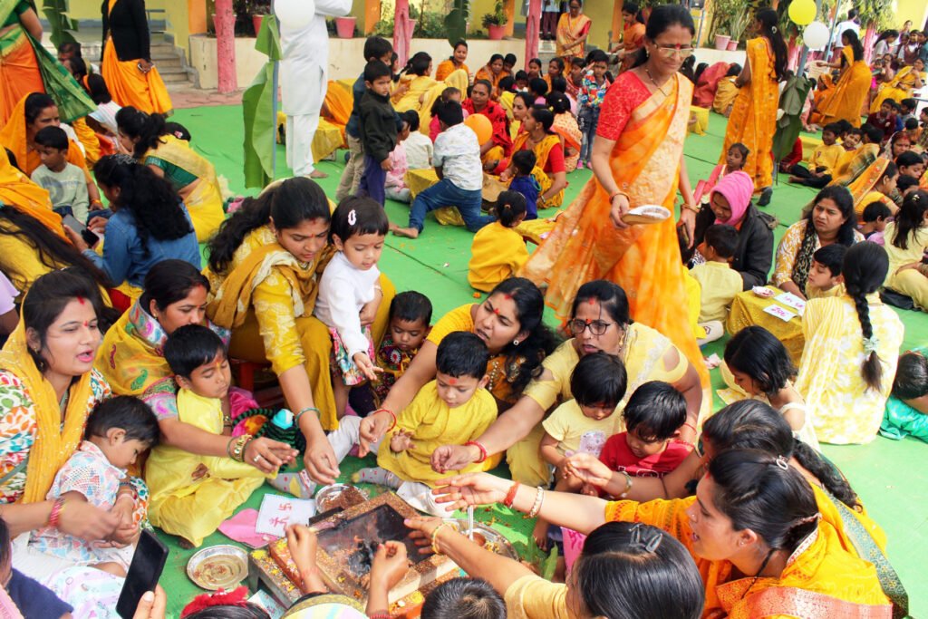 माताओं ने अपनी गोद में नौनिहालों को लेकर शिशु के दाहिने हाथ से ‘ओम’ और स्वस्तिक की आकृति बनवाई। ओंकार ध्वनि के साथ हवन में आहुति देकर शिशुओं का विद्यारंभ संस्कार संपन्न कराया गया।